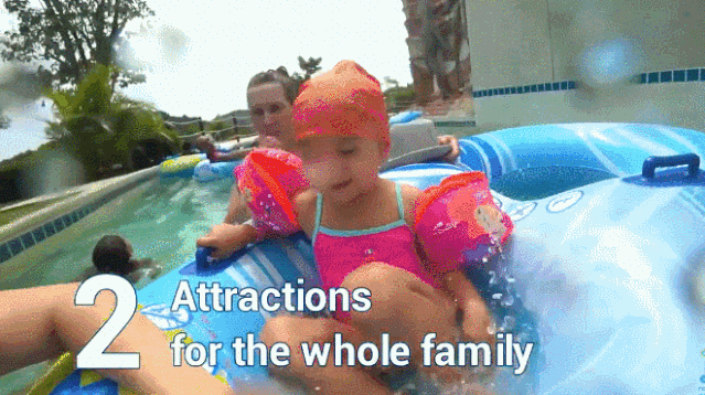 230米的超长滑道与近乎垂直的16米高滑水梯,一定是追求刺激的年轻朋友们必玩项目。如果对自己的胆量不太放心,那么冲天回旋滑道非常适合你,双人泳圈可以和好朋友同坐,一起被推向与地面垂直的高空滑板,感受地心引力的魅力和激荡的水花洒落在肌肤上的清凉。如果是带孩子前去,且小朋友的身高达到1.2M这也是非常好的亲子同玩项目。
