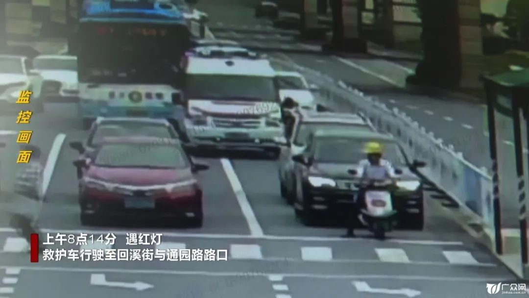 8点14分,救护车行驶至回溪街与通园路路口时遇到了红灯,只能缓缓停下。