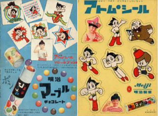再将目光转向日本。日本早在上世纪五十年代就出现了以《日本沉没》为代表的基于流行文学作品改编影视的现象,但真正意义上的“大IP”操作直到六十年代才发生。1963年日本动画的先驱人物手冢治虫经典作品《铁臂阿童木》动画版播出,当时日本制作公司为了获取经费已经开始寻求企业的商业赞助,1960年松下电器赞助真人特摄电视剧《国立少年》,播出后效果欠佳。手冢效法迪士尼出售版权使用费,版权形象和商业深度捆绑,明治当年推出的新款巧克力成为动画中的重要道具,由于糖果和动画的受众都是儿童,市场反响令商家狂喜。明治制果的主要竞争对手森永糖果当年也推出了新品巧克力,森永于同年赞助播出长篇动画《狼少年肯》,由于动画缺乏原作基础,商业合作并没有取得明治那样的效果,在后续竞争中,森永从迪士尼手中购入“唐老鸭”的版权,效法明治和巧克力产品捆绑,但此时明治已经开发出更多花样,买巧克力附赠阿童木贴纸和阿童木玩具,开启了日本“食玩”时代(即在零食中附赠玩具促销)。明治在和森永斗法中大获全胜,明治赞助阿童木系列广播和后续动画作品制作,阿童木形象也在很长一段时间里和明治制果深度捆绑。明治和阿童木的成功案例对日本版权领域造成了深远的影响,在商业驱动下,虚构形象跨媒介获得生机,而与该形象捆绑的商业则获得宣传效果,原本针对作品的文化消费通过跨媒介平台的加入进入物质消费领域。