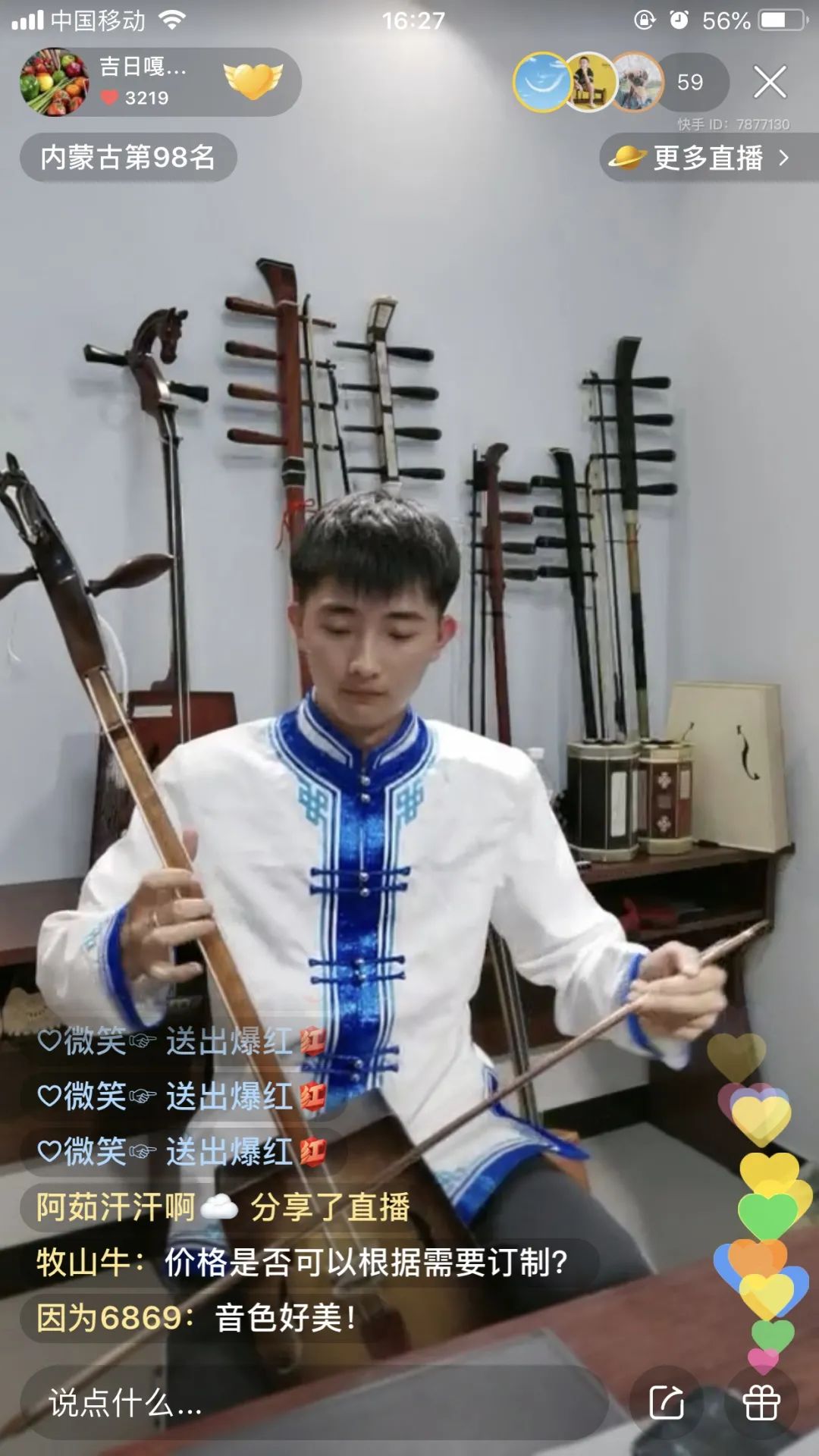 “感谢大家关注!我们直播间这三款马头琴,低中高档,马头琴材质:面板白松,低档也有泡桐木。琴身和雕刻都是五角枫……”5月8日下午,开鲁县吉日嘎郎吐镇扶贫助农平台快手直播间(账号:7877130)内,主播正在介绍和展示开鲁县吉日嘎郎吐镇的马头琴蒙元文化,从做工、材质等方面娓娓道来,大家纷纷下单支持,直播一开场就热闹了起来。