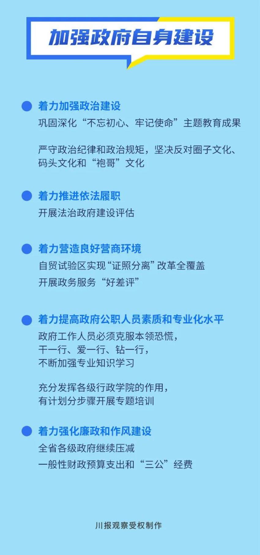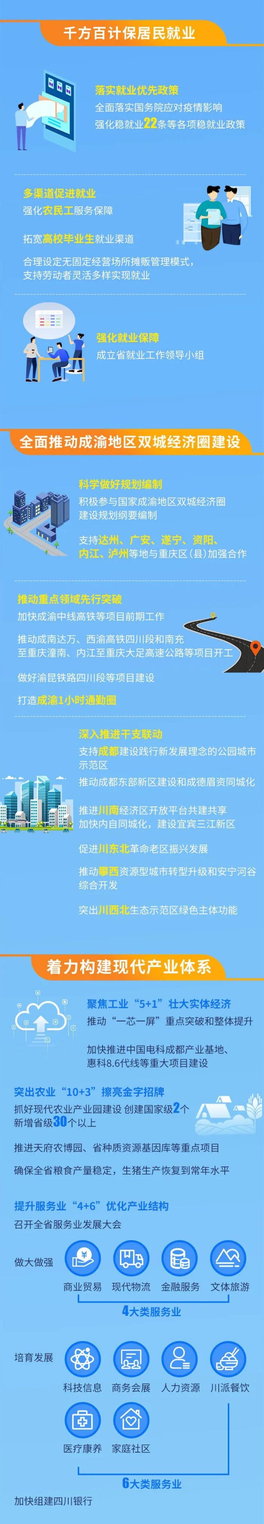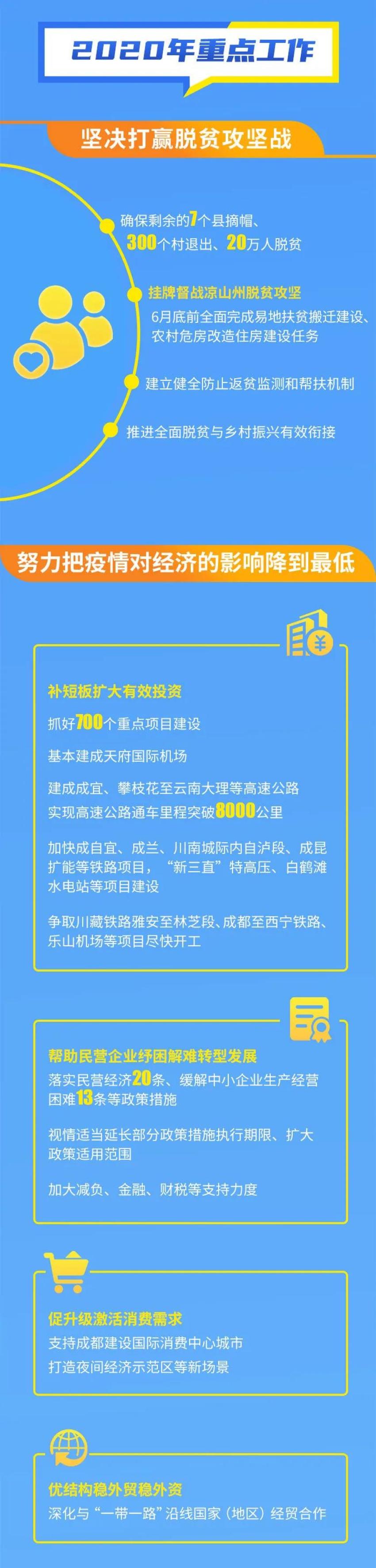 今年政府工作的总体要求是:以习近平新时代中国特色社会主义思想为指导,增强“四个意识”、坚定“四个自信”、做到“两个维护”,全面落实习近平总书记对四川工作系列重要指示精神,按照省委决策部署,统筹推进疫情防控和经济社会发展,坚持稳中求进工作总基调,坚持新发展理念,坚持以供给侧结构性改革为主线,坚持以改革开放为动力推动高质量发展,扎实做好“六稳”工作,全面落实“六保”任务,大力推动成渝地区双城经济圈建设,深入实施“一干多支、五区协同”“四向拓展、全域开放”,迎难而上、共克时艰,确保打赢脱贫攻坚战,确保实现全面建成小康社会的目标任务。