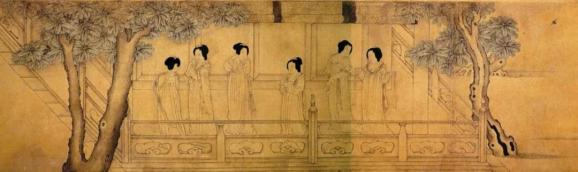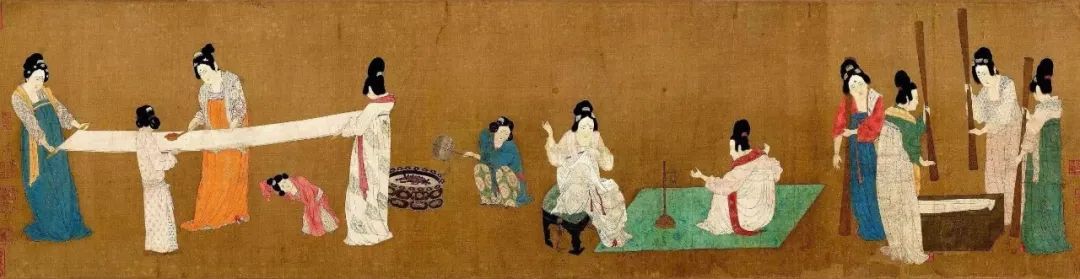 牟益的《捣衣图》描绘了女子们结伴为远征的丈夫捣练制衣的场景。画中共有32名妇女,这些女子们有的在捣练、有的在剪裁、还有的在缝衣。