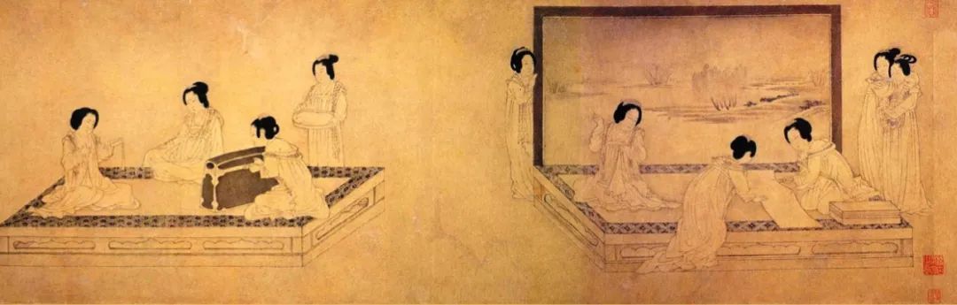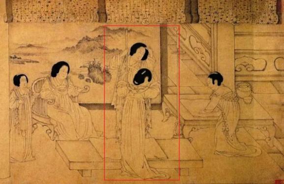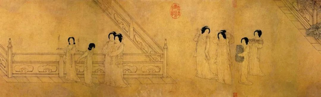 周昉是著名画家张萱的学生,有趣的是张萱也有一幅《捣练图》传世。与牟益的《捣衣图》明显不同之处在于,张萱的《捣练图》是设色画,整个画面色彩绚丽典雅,十分注重画中女子们衣着妆容的刻画。