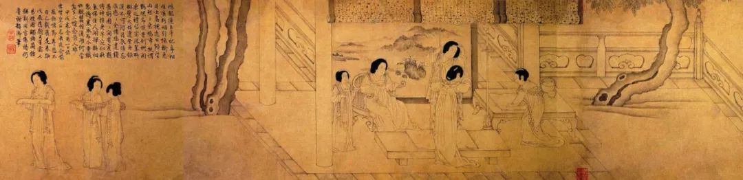 在这幅长卷中,与“捣衣”意象最切题的,当属画面左起第四组劳动的女子们了。