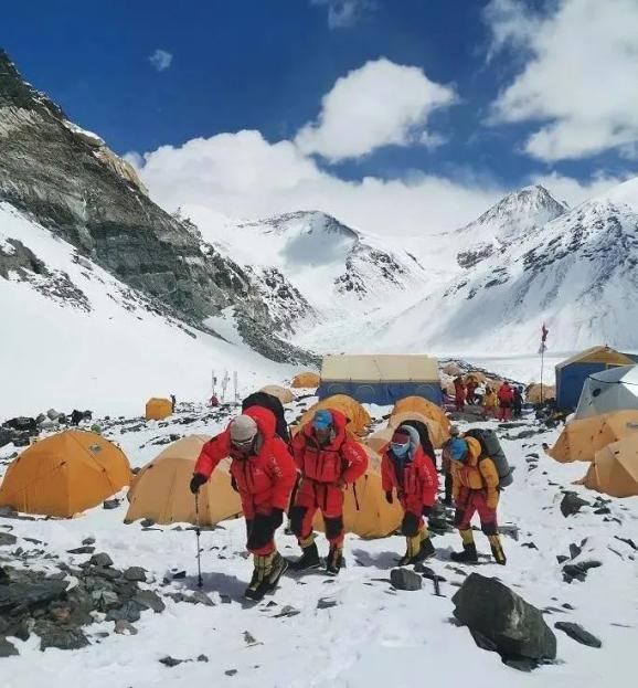 因为天气原因,9日,2020珠峰高程测量登山队队员分两批从海拔6500米的前进营地撤回大本营进行休整。
