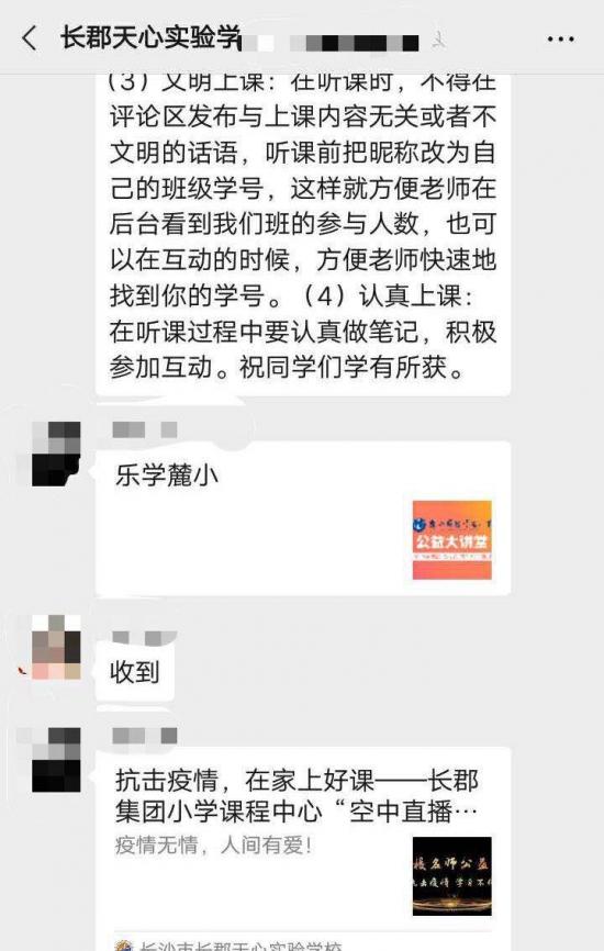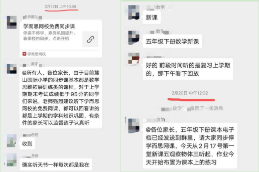 2月12日,数学老师在班级群内建议:期末考试95分以下的同学选择“学而思网校”的免费同步课。随后,又在2月20日直接“@各位家长”,要求所有家长和同学们观看“学而思网课”,并将电子课本发送到群内。但正因为跟进“学而思网校”进度,因此在3月长沙市正式开始全市教育统一直播时,进度超前无法协调,因此舍弃市教育局统一教学直播,选择了继续学而思网校学习。但实际上,教育部2月4日便发文提醒不要提前开始新学期课程网上教学。