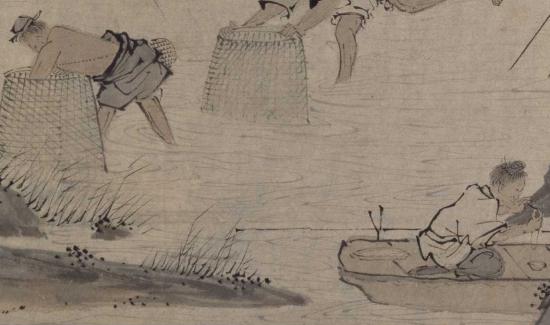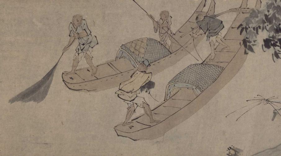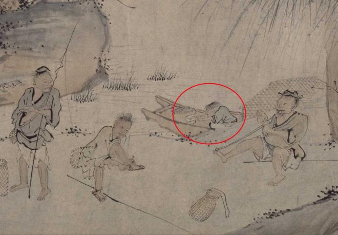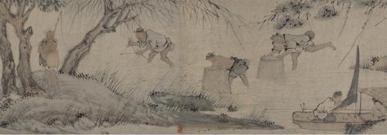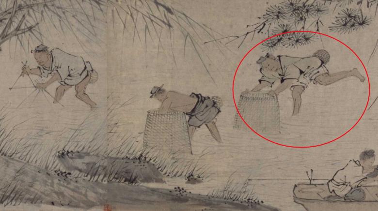 而且画家还擅长通过浓淡和色彩的变化来增强线条的表现力,主要体现在画面中的水纹上。若有若无的水纹,使得水中的劳作场景颇具动感。