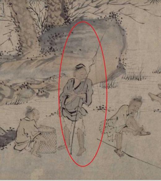 这是一幅充满了浓郁生活气息的渔民劳作图。一共分为三组劳动场景。我们从右边看起,在第一组人物中,有几个渔夫正在岸上编织渔网和竹篓。