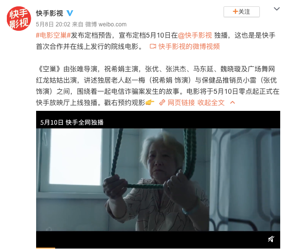继字节跳动旗下的抖音、西瓜视频、今日头条接连上线《囧妈》、《大赢家》等院线电影之后,快手也开始入局,在微博上新注册的“快手影视”在8日发布第一条微博,宣布上线平台首次合作并在线上发行的院线电影《空巢》,并选择在母亲节这一天零点起在快手放映厅独播。