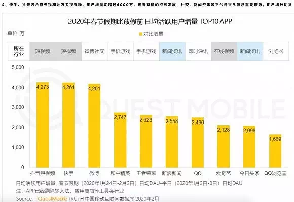 疫情期间,短视频平台如快手、抖音等流媒体平台的用户增长明显,根据QuestMobile数据,短视频在春节期间的日均活跃用户增量排名第一,超过8000万。