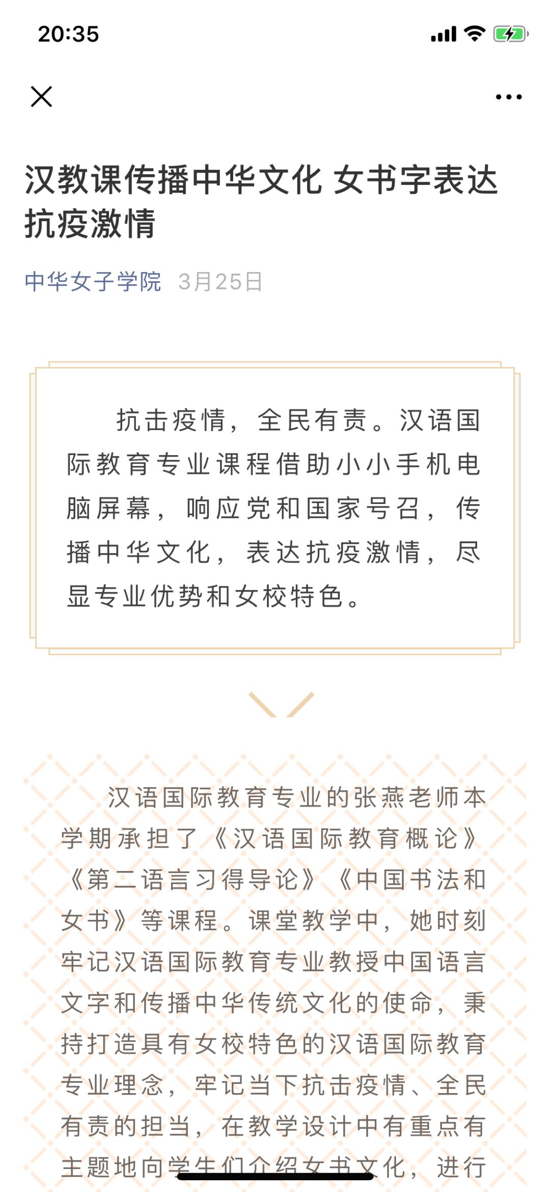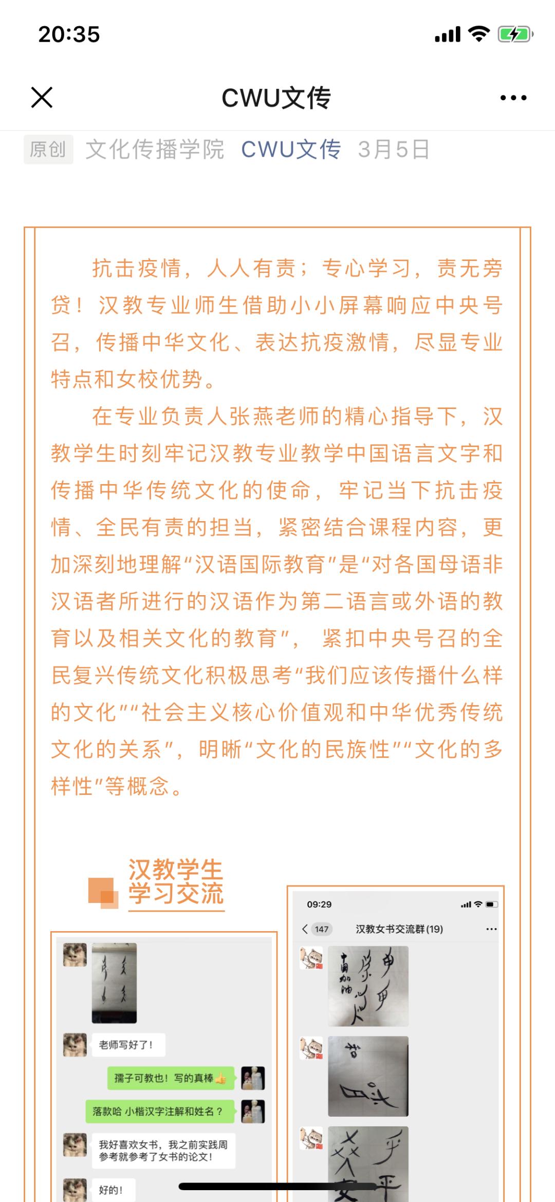 2.学生依此申请国家级大学生创新实践项目,希望依此进行女书的教学和宣传推广。中外学生的女书作品发表于中华女子学校官方微信公众号以及文化传播学院公众号上。