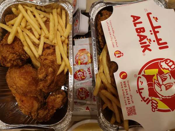 走进这家炸鸡店Al Baik,我才明白它有多火爆:点单台排着长长的队伍,点完等着取餐的顾客络绎不绝。我们几个人有男有女,只能去家庭区域寻找空位,但来来回回找了十几分钟,都没有找到空桌。与我们一样寻找空桌的人,也都只能在别人的“包厢”外等着,同时环顾四周,观察哪个“包厢”的人可能会离开。