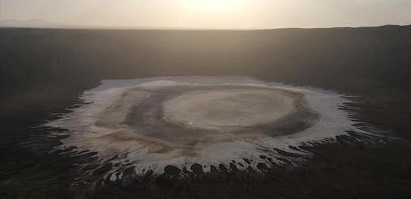 日出前,帐篷外就出现了脚步声。我起床时,太阳刚刚出来。从我所在观景台向下望去,纵深250多米、宽约2公里、由乳白色的磷酸钠晶体组成的椭圆形地面,像是被陨石砸出的大坑一样。实际上,对这个火山口的成因,还没有准确的说法,确实有理论认为它是陨石撞击的结果。但更普遍被接受的理论认为,这是岩浆喷发导致地下水与岩浆混合而形成的地貌。从形态来看,乳白色的磷酸钠晶体有明显的喷射痕迹,像是化开的冰激凌,一直蔓延到大坑的边缘。早起的人们无不对着这壮丽而独特的自然景观连连赞叹。