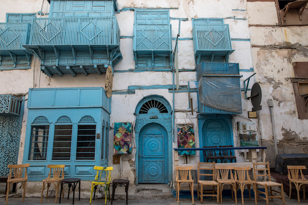 与沙特其他死气沉沉的城市不同,吉达老城虽然建筑古朴,却散发着蓬勃的艺术气息。建筑的外墙大部分被涂成白色,凸出的木结构窗棂被刷上鲜亮的蓝色、绿色、黄色、咖啡色,雕有精美的图案。在满是现代建筑的吉达,这些建筑像是用厚纸板裁切出来的舞台剧布景,虽然看上去华而不实,却格外赏心悦目。