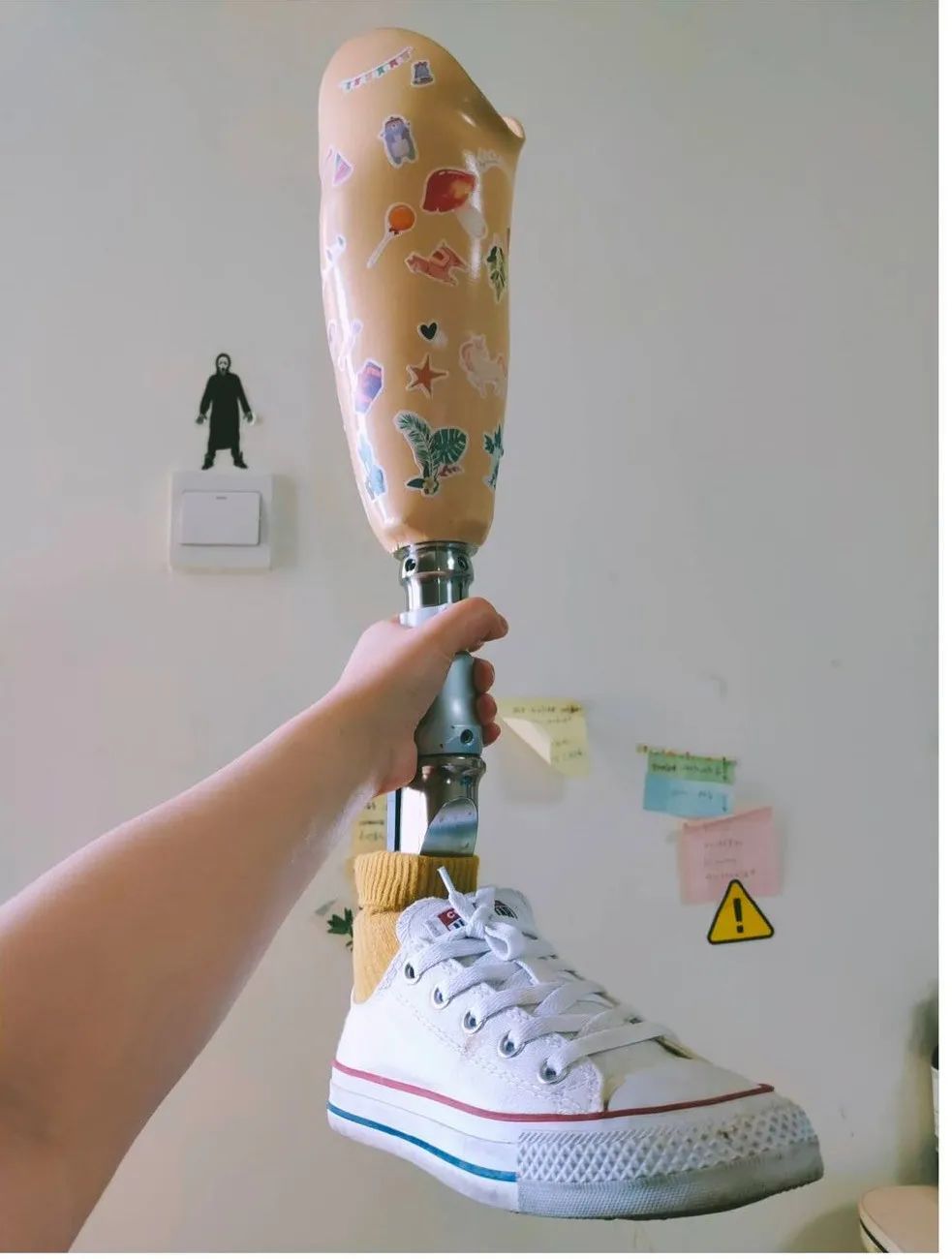 她给义肢贴上喜欢的贴纸,小心翼翼地呵护,在微博上开玩笑说: