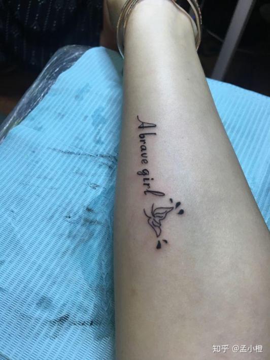 不久前,橙子在手上,纹了美人鱼的尾巴,旁边写了一串英文「A brave girl」。