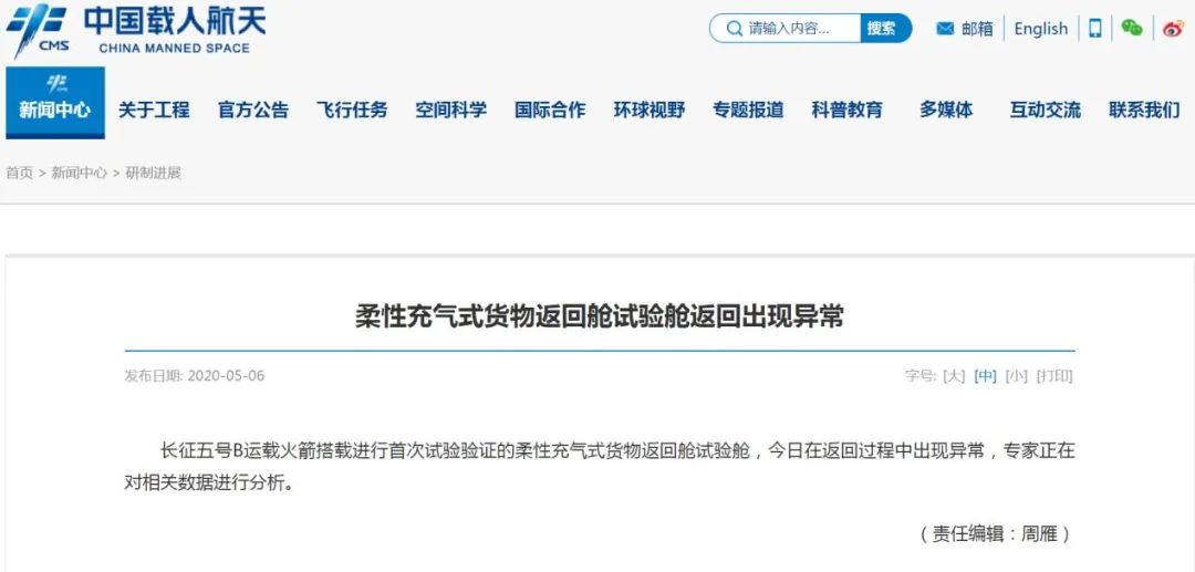中科院之声微信公号5月12日消息,5月6日,正当我们为长五B发射成功欢庆之时,中国载人航天突然宣布这样一项异常: