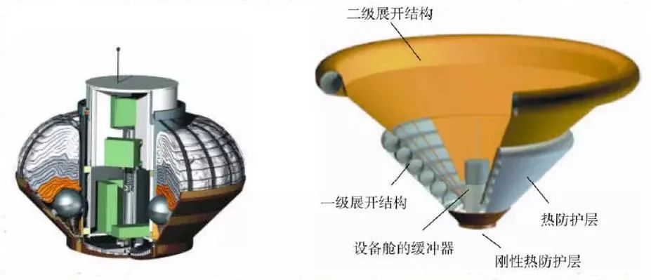 俄罗斯充气再入与降落模块的收拢和展开外形示意图