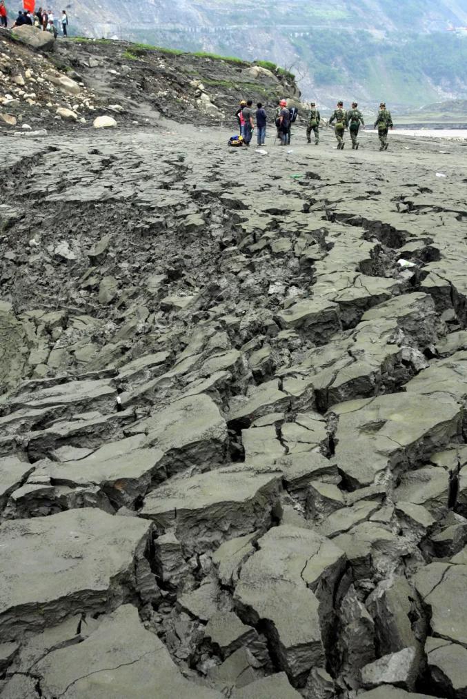 ▲2008年5月16日,汶川县水磨镇的公路被毁,上海公安消防救援队徒手在地震废墟中搜救幸存者。