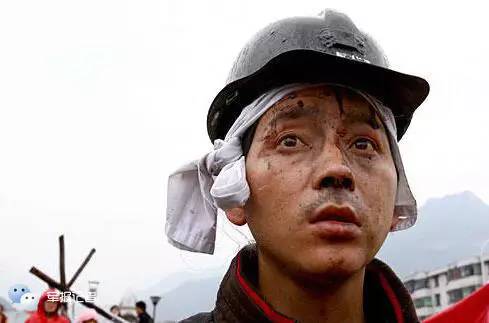 ▲一位头部受伤、满脸血迹的救灾人员在四川德阳地区的绵竹市救灾现场。