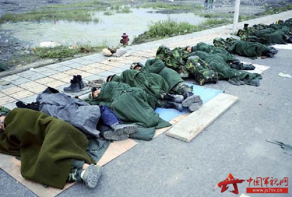 ▲2008年5月15日凌晨,参加抗震救灾的济南军区某部战士在汶川县映秀镇街头休息。