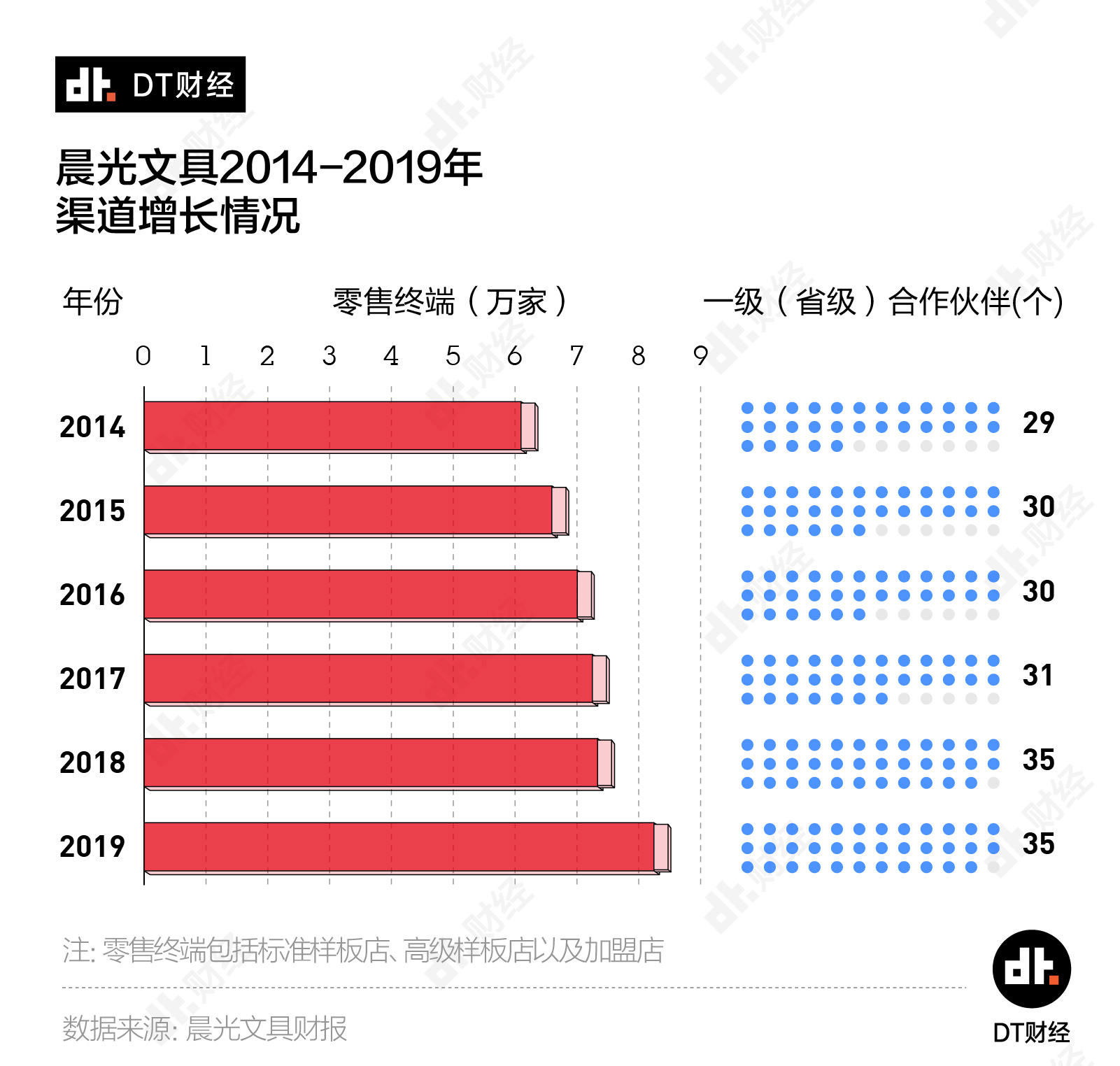不管是合作经销商还是线下样板店和加盟店的数量,都实现了快速增长。在这种模式下,晨光文具店一步步将自己的红黑色招牌挂满了全国。