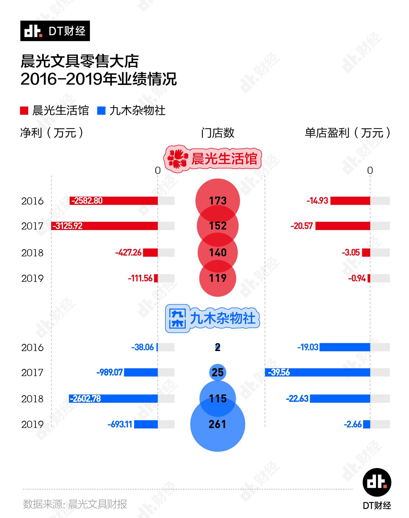 新业态在初期的经营情况并不理想,公司一度依靠关店来控制晨光生活馆的亏损。但在另一头,九木杂物社的门店数量不断增加,从2家扩大到261家,单店亏损从2016年的19万元降至2019年的2.7万元。