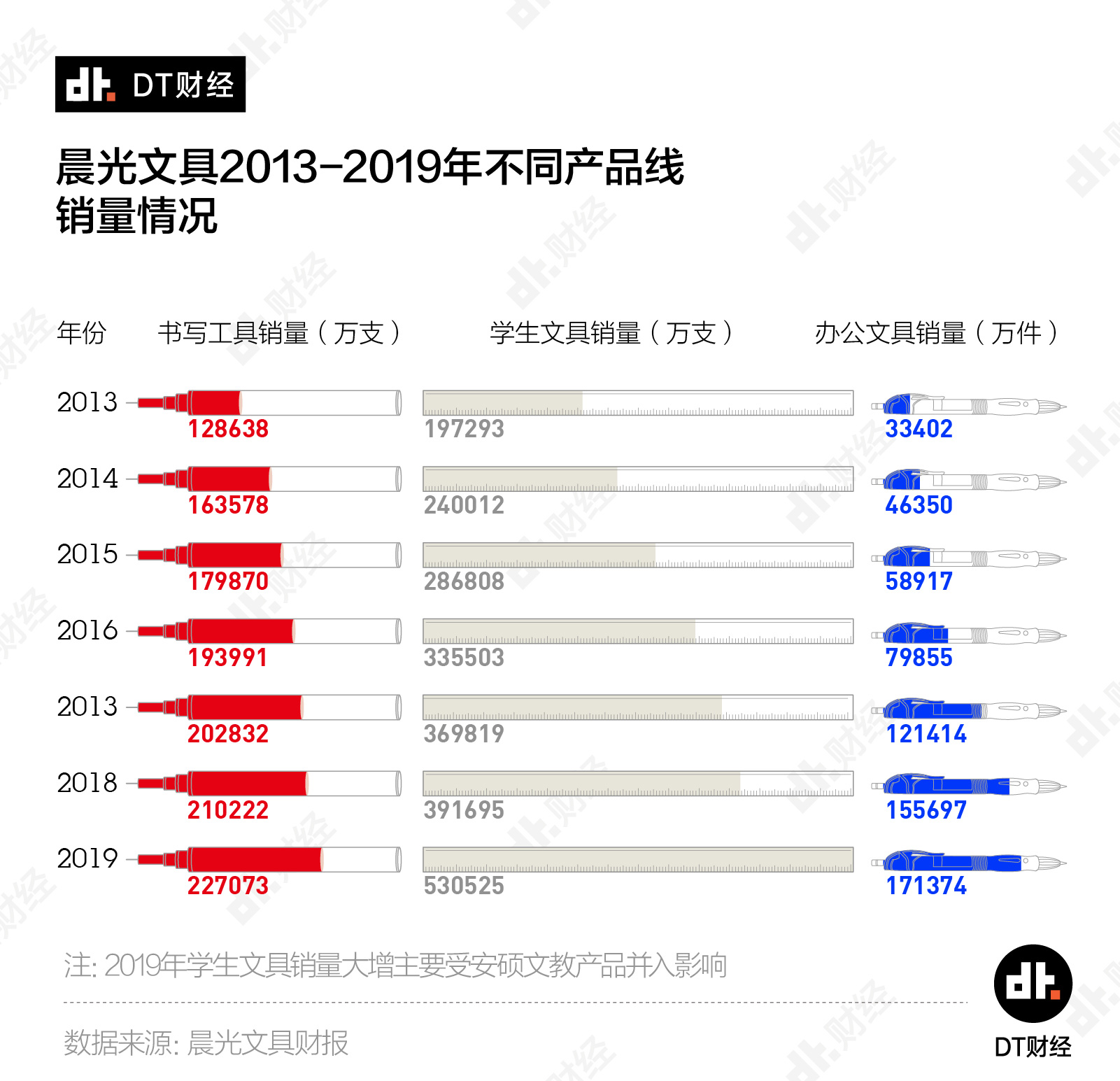 对市场的快速占领,使得晨光笔越卖越多。2013年,晨光笔卖出了接近13亿支,平均我国人手一支,到了2019年,晨光笔类产品销量已经接近23亿支。学生文具和办公文具的销量也分别从19.7亿、3.3亿件增长到了53亿和17亿件。