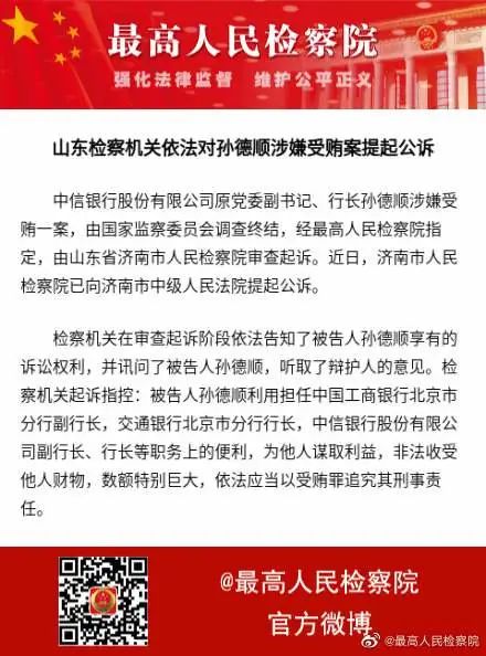 原标题:《中信银行原行长孙德顺被提起公诉》