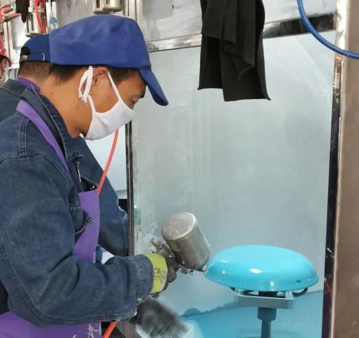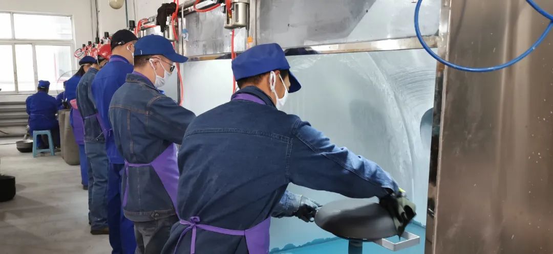 走进车间,一名身穿蓝色工作服的工人从旋转架上取下锅具粗胚,在工作台上擦拭干净后,右手持喷枪在粗胚外部均匀地涂覆搪瓷釉料……金镒康公司总经理汪世磊介绍说:“这是喷涂环节,接下来是烧成。这属于搪瓷工艺,也叫珐琅,这种工艺既有金属固有的机械强度和加工性能,还有瓷釉具有的耐腐、耐磨、耐热、无毒及可装饰性,将铁锅的实用价值和珐琅的美感完美结合在一起。”