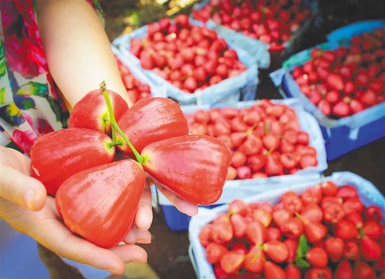 趁着红艳莲雾挂在枝头,亲手从树上采摘下来,更能尝到这第一手的新鲜。