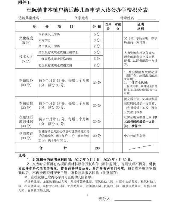 附件1:《杜阮镇非本镇户籍适龄儿童申请入读公办学校积分表》