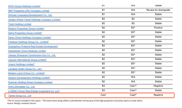 部分穆迪评级的47家房企评级排名,泰禾排名最差(来源:穆迪公告)