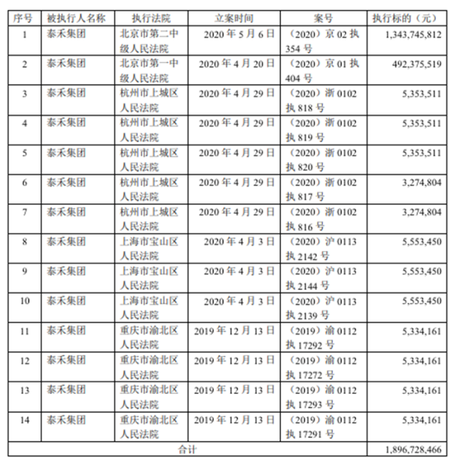 同时,泰禾集团被列为被执行人的执行标的累计金额为18.97亿元,超过最近一期经审计净资产的10%。