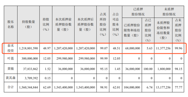 根据泰禾集团今年1月的公告,控股股东及其一致行动人未来半年内到期的质押股份累计数量为38,760万股,占其所持股份比例为24.84%,占公司总股本比例为15.57%,所对应融资余额为12.65亿元;未来一年内到期的质押股份累计数量为71,550股,占其所持股份比例为45.86%,占公司总股本比例为28.75%,所对应融资余额为23.66亿元;还款资金来源为其自有资金、投资收益以及融资资金。