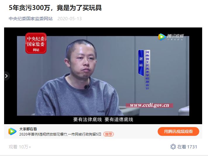 据中央纪委国家监委网站5月13日发布的一则视频介绍,河南省工艺美术学校原会计谢屾通过篡改职工个税、公积金、退休补贴的形式5年累计贪污近300万元,其中大部分款项用于购买玩具和充值游戏。