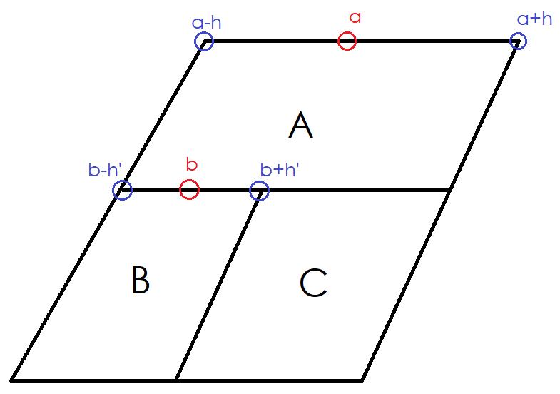 h 对细分程度的依赖是必要的,因为细分越多,每个 patch 就越小。因此,中心点 t 应为两个距离较近的点的平均值。例如,以下(多边形)patch 被分割为三个子 patch:A、B 和 C。