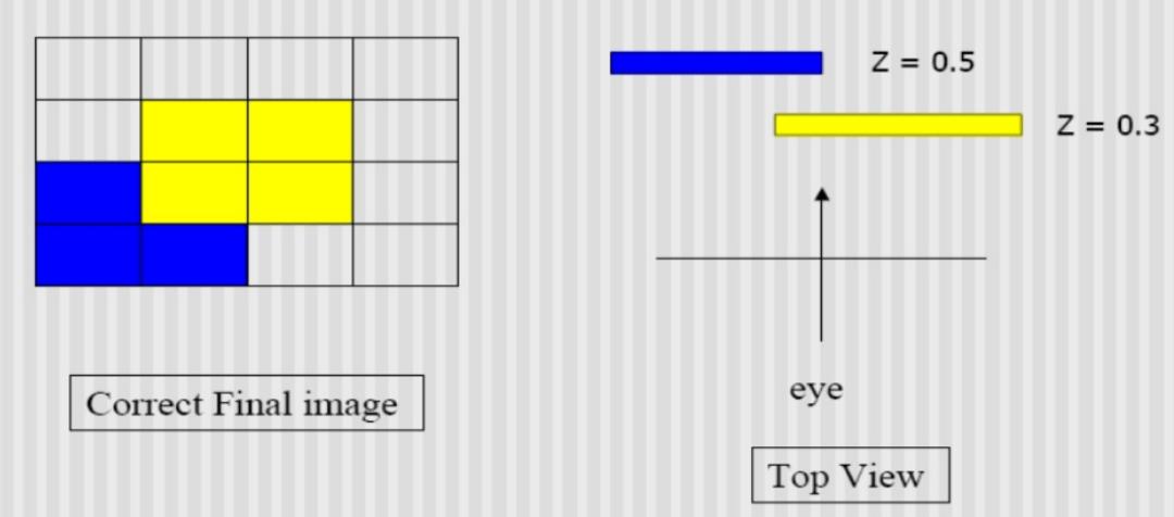 画家算法(Painter’s algorithm):根据深度对场景中的所有多边形进行排序,然后按照从远到近的顺序进行绘画。多用于(简单的)视频游戏中。