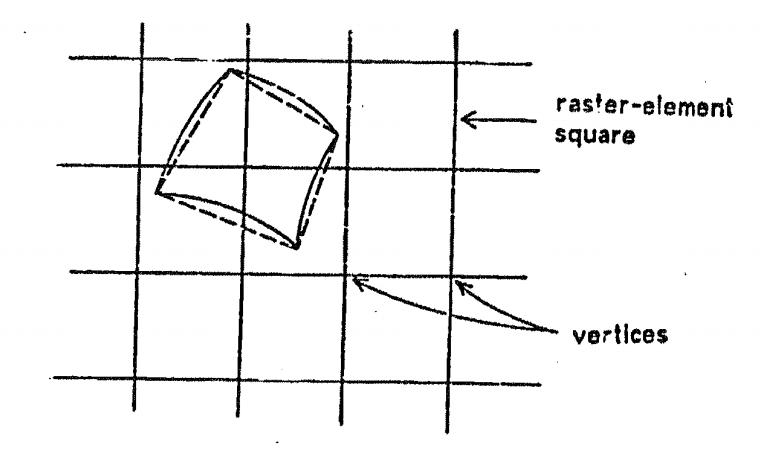 为了显示弯曲的 patch,我们必须定义图像空间与光栅之间的关系,以便将投影图像中的信息转换为光栅中的信息。屏幕被分割为一个个小正方形,即光栅元素方块(raster element square),每个光栅元素方块都与光栅元素一一对应。下图 1 显示了不同空间之间的关系,以及图像空间、帧缓存和真实显示结果之间的关系。
