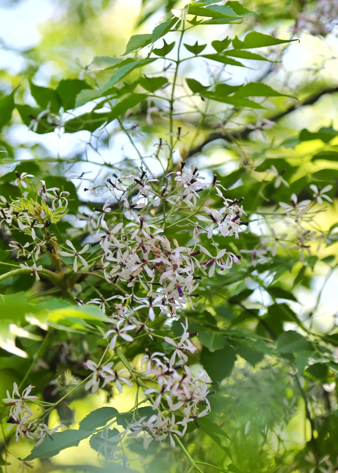 繁密的树叶间紫白相间的小花