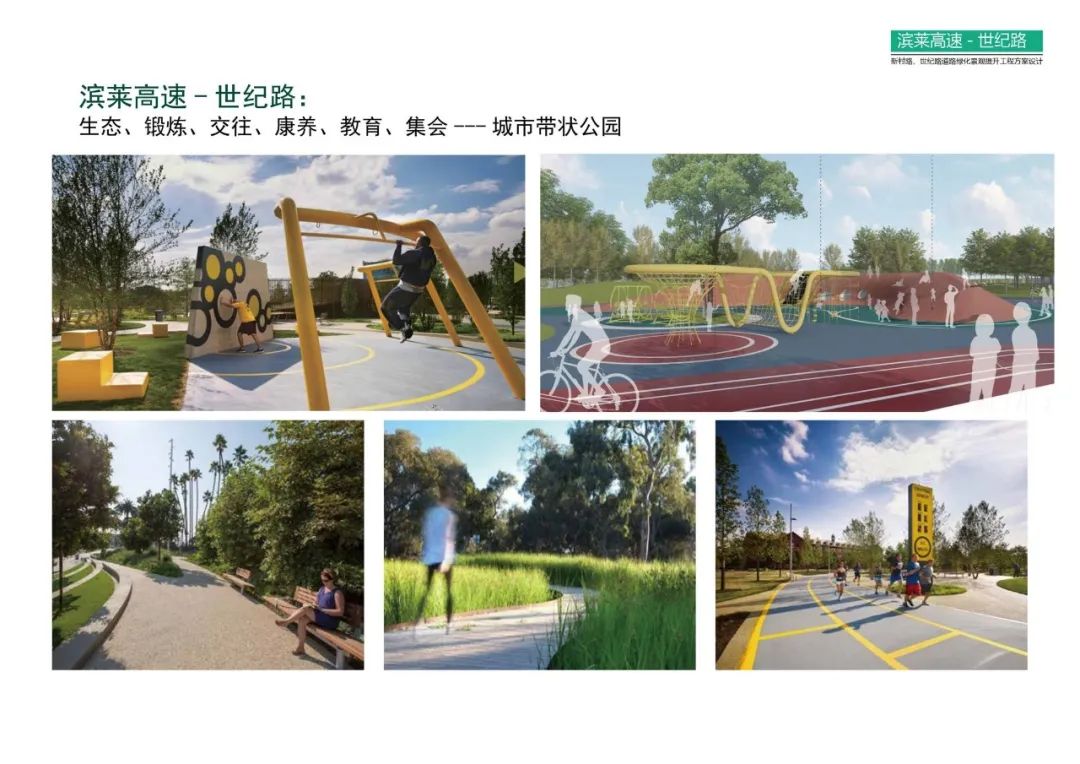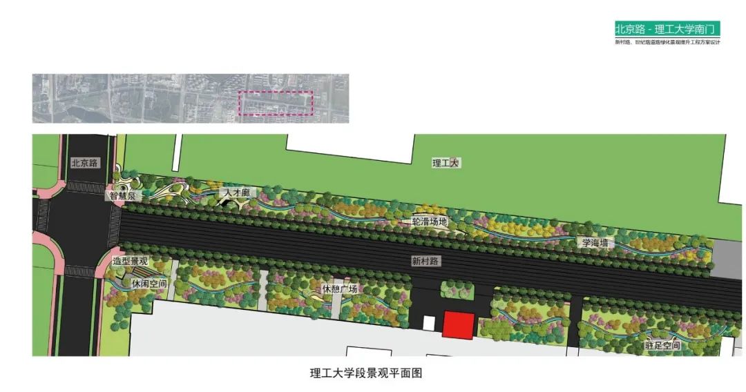 新村路的设计分为一带两段多节点,一带就是道路两侧机非隔离带,两段是以世纪路(西七路)为界,将整条路分为东西两个段落,其中西段多带状公园,东段多口袋公园。这条路上,将全线打造带状绿地系统,向外延伸,利用一条3米宽的慢行系统,将道路两侧的公园、游园等绿地系统串联。