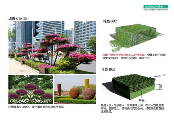 据介绍,柳泉路至金晶大道段原有的隔离带利用破旧的路沿石抬高,档次低,景观效果差,再加上隔离带踩踏、设施硬化严重,导致了整条路上隔离带绿化残缺,严重破坏景观效果。而路灯硬化区域原来采用的是绿色人造草坪,处理较为粗糙,景观效果较差。隔离带设计打破原有的单行道树种植模式,在靠近路口处,增加了组团式的盆景植物组,配合以时令花卉,打造“三季有花”的精细化景观模式。世纪路以东绿化带较为狭窄,设计在隔离带中增加造型树种配时令花卉,从而大大提升了该路段的整体园林效果,保证三季花开不辍。