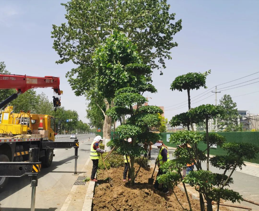 新村路是主城区连通周村和临淄的一条城市主干道,主城区的东西两个窗口都是绿化的重点。5月13日上午,记者在该路段原山大道路口施工现场看到,工人们正在进行绿化树栽植。“抬高,扶好了,准备落。”随着施工人员的口令,吊车将一棵小叶女贞缓慢移到挖好的土坑里,随后园林工人再对树木进行填土栽种。这里将是一个小游园。