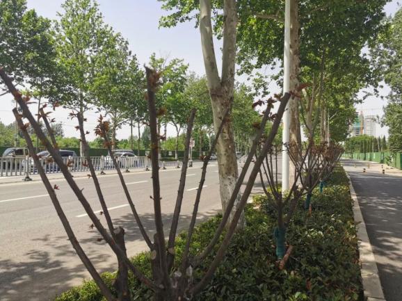 该路从滨莱高速到东四路,长达12公里的路段上,大大小小规划设计了12个公园,以生态绿道串联成一片花海。“这条路设计的主要行道树是法桐配美人梅,以休闲和绿色为设计特色。沿路有河道,有公园,有居住区,有学校,也有医院,生态绿地系统需要多种形式,满足不同人群,所以这条路在设计时,考虑了多种方案,最终选定对绿化带和隔离带进行景观改造提升,同时根据城市环境对周边绿化进行总体提升的模式。”