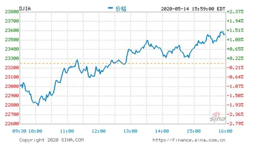 北京时间5月15日凌晨,美股低开高走,道指上涨370点结束三连跌,银行股领涨。道琼斯指数上涨377.37点,涨幅1.62%,报收23625.34点;纳斯达克指数上涨80.55点,涨幅0.91%,报收8943.72点;标普500指数上涨32.50点,涨幅为1.15%,报收2852.50点。具体来看,银行板块涨幅领先,美国运通收高7.4%。摩根大通收高4.2%。尽管如此,美股三大指数仍可能为3月20日以来的最差一周表现。标普500指数和道指本周跌幅均超过3.5%,而纳斯达克指数则下跌了3%。