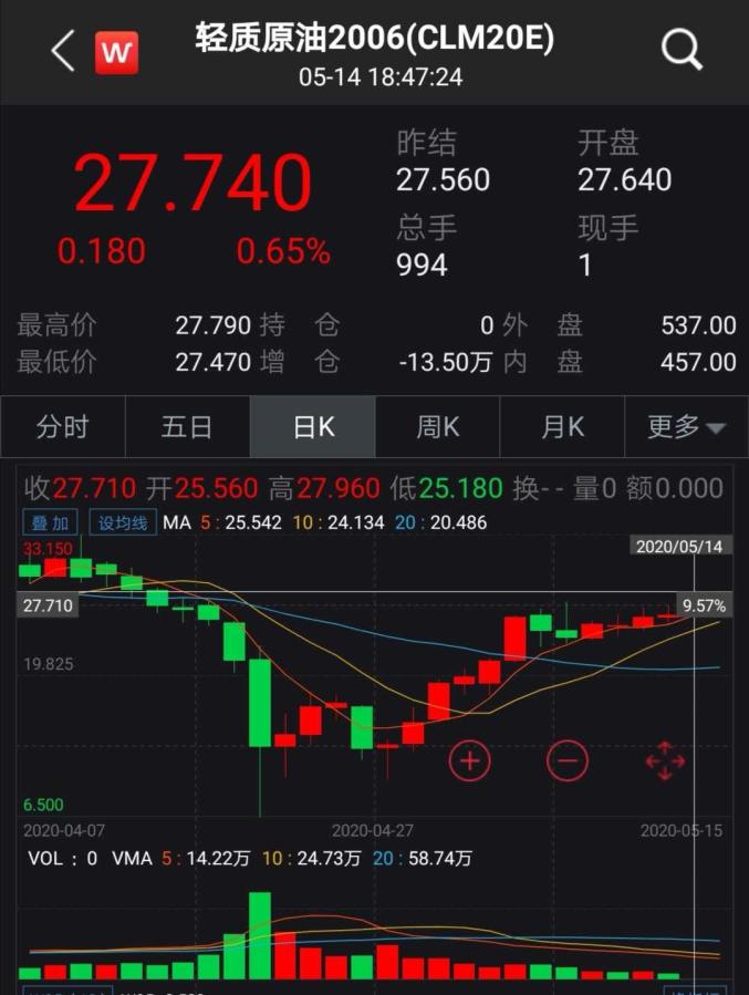 周四国际油价集体走高,美油6月合约收涨9.57%报27.71美元/桶,美油7月合约收涨8.96%报27.98美元/桶,创一个月以来新高;布油收涨7.74%报31.45美元/桶,创半个月以来新高。