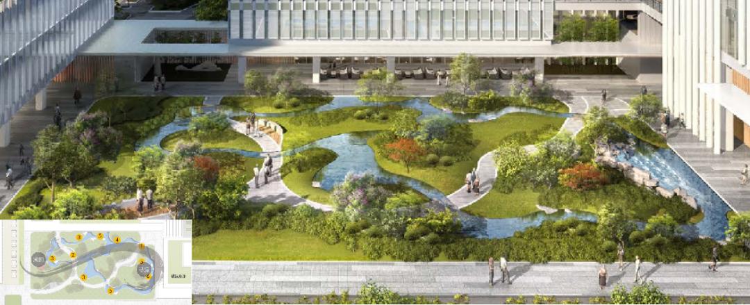 在规整典雅的办公组团中,以折叠的纽带造型打造连续的骑楼步行区域,串联起各主要功能块以及花园,加强空间互动性,并在公共空间组团中引入一弯曲水,以叠水为源,鱼群探寻水源为线索,丰富庭院的游览体验,形成舒适宜人的商务环境。