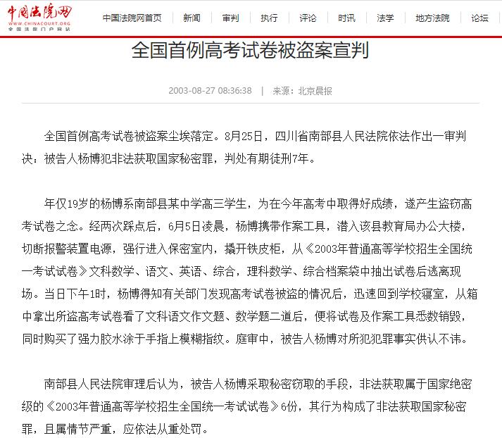杨博是文科,本来光偷文科试卷就够了。但他当时想的很多,他特意盗走了理科试卷,是想送给一位要好的同学做人情。