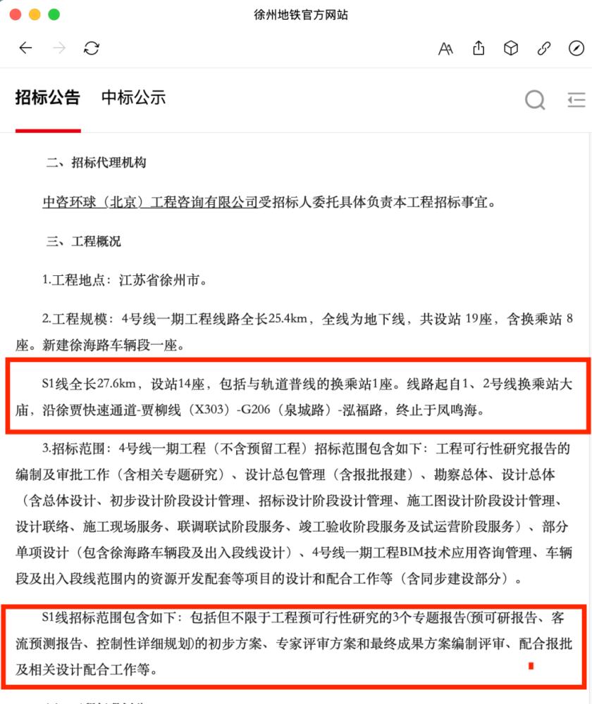 5月15日,徐州地铁官网发布《徐州市城市轨道交通4号线一期工程可行性研究和设计总体总包招标公告(资格后审)》,其中包括S1号线。