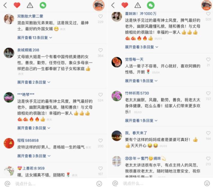 如今杨姐一家的幸福生活,也是在磨合中促成。从最开始老太太对英文一窍不通,到现在能够简单进行日常对话,和Peter交流时多半还是基于彼此的了解。在杨姐的快手视频中,总能看见老太太与Peter沟通时“手脚并用”,肢体语言和表情也没落下。想说“鸡爪”这个词,老太太会先学公鸡打鸣,然后再指自己的脚,“OK”,女婿秒懂。